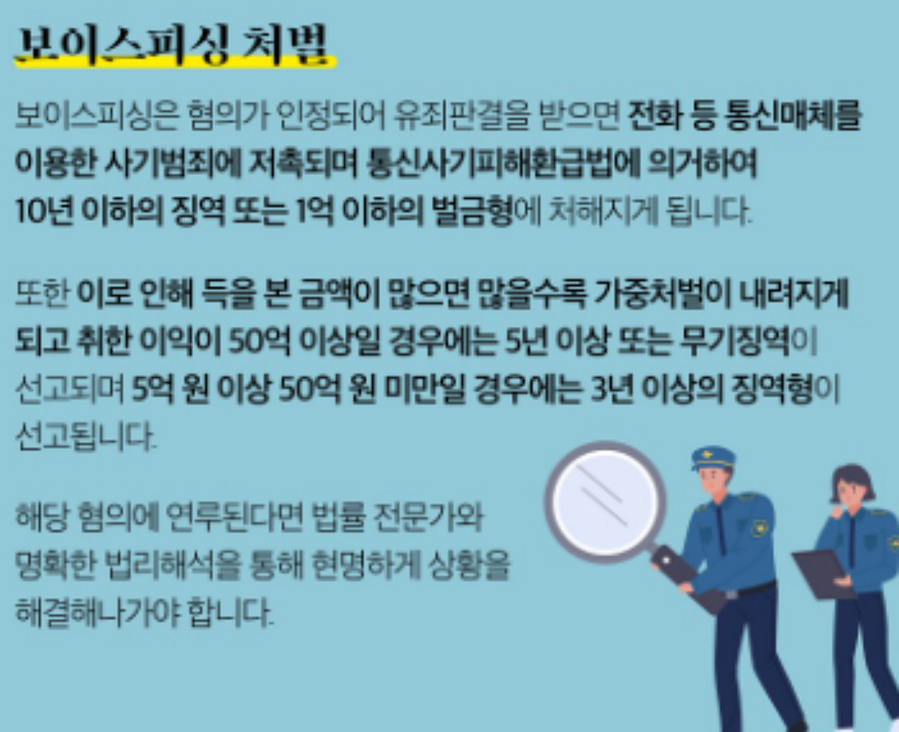 시대가 바뀌면서 점점 많은 신종사기 수법들이 생겨나고 있습니다. 그중에서 가장 많은 신종사기가 생기고 피해를 입는 것중 하나가 보이스피싱입니다. 혹시 모르는 나의 주변인이 보이스피싱에 당했을 수도 있기 때문에 나라도 절대 방싱할 수 없습니다. 그래서 보이스피싱 당하지 않는방법은 어떻게 해야되는걸까? 그리고 혹시나 내가 보이스피싱 다하고 범죄자를 잡았을 때 보이스피싱 처벌에 대한 기준은 벌금은? 형량은 어느정도일까? 지금 설명드리겠습니다.