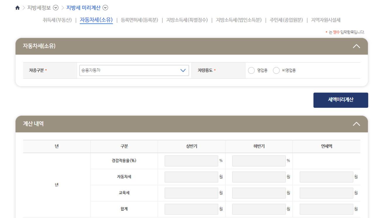자동차세는 본인 명의로 되어있는 자동차를 소유하고 있을 시 운행하는데 있어서 도로이용료 지불과 환경오염이유에 대한 지불이라고 보시면 됩니다. 과세대상은 영업용차량이 비영업용 차량에 비하여 적은 세액이 적용된다고 합니다. 또 자동차 연식이 3년 차같은 경우는 1년에 5%씩, 50%까지 세액을 할인받을 수 있습니다. 그리고 자동차 등록 원부나 건설기계 등록 원부에 등재되어있는 소유자분들은 납세자이고 대상 차량에 대하여 고지서가 발송됩니다. 소유하신 차량에 대하여는 자동차세 모의 계산이 가능합니다.