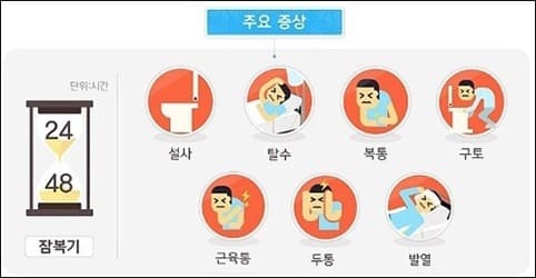 그리고 노로바이러스와 로타바이러스 같은 경우는 바이러스성 식중독으로 분류가 됩니다. 노로바이러스 같은 경우는 물을 통하여 감염되는 경우들이 있고 로타바이러스 같은 경우는 겨울철 영유아에게 발견되는 경우들이 많이 있습니다. 그럼 식중독의 종류와 원인 그리고 잠복기에 대한 설명을 드렸는데 식중독 증상은 어떤것들이 있는걸까? 식중독에 걸렸다면 [구토, 설사와 같은 증상이 기본적으로 발생합니다. 몸속에서 바이러스를 배출시키려고 하는 증상입니다. 그리고 심해진다면 복통, 발열, 두드러기가 나타나게 됩니다. 여기서 두드러기는 음식에 들어있는 독소로 인하여 나타나는 증상인데 특정 음식물에 특정 사람에게 나타나게 되는 증상들 입니다. 이때는 빠르게 병원으로 가야 합니다. 그리고 식중독 증상으로 설사, 구토를 2일 이상 지속적으로 한다면 복통이 심해지고 고열이 나기 시작합니다. 이때는 추가적 검사도 필요하지만 식중독 증상에 걸리면 수분섭취를 꾸준히 해주어야 합니다. 탈수증상이 나면 쓰러질 수도 있기 때문입니다. 그리고 설사가 심해진다면 전해질 불균형으로 이온음료를 마시는 것이 큰 도움이 될 수 있습니다.] 식중독을 예방하기 위해서는 깨끗이 손을 씻고 음식을 섭취해야 합니다. 그리고 오랜시간 밖에 음식을 놔뒀을 때 음식의 냄새를 맏아 봐야 하고 음식에 냄새가 안난다고 해도 주변 해충들로 부터 오염되었을 수도 있으니 되도록 냉장 보관하는 것이 가장 좋습니다.
