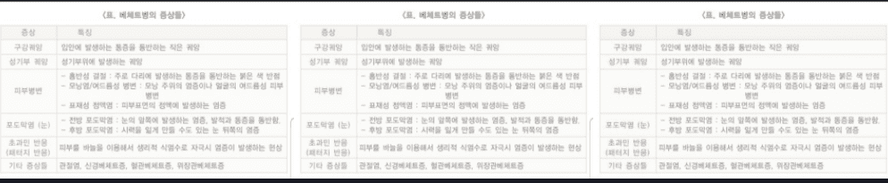 베체트병 증상은? 베체트병은 희귀질환이기 때문에 여러가지 증상들이 발생할 수 있는 부분들이 있습니다. [1)음부궤양 (구강궤양과 비슷하게 재발을 잘하는 경향을 가지고 있는 환자들로는 60 ~ 80% 사이로 발생한다고 합니다. 여성은 외음부, 남성은 음낭에 발생된다고 합니다.), 2)구강궤양 (구강 궤양이 가장 먼저 환자들에게 나타나는 질병이라고 알려져 있는데 한개의 혹은 여러개로 생길 수도 있다고 하며 구강 또는 혀, 잇몸등의 여러 부위에 발생하게 될 수도 있다 합니다. 또 통증이 심하여 음식물 섭취를 할 때 통증이 심하게 생길 수 있다고 합니다.) 3)피부질환 (홍본, 가성모낭염, 농포, 여드름 등의 피부질환이 발생하는 것으로 위치는 허벅지, 얼굴, 몸 전체에 가리지 않고 생긴다고 합니다.) 4)눈 (안구에 침범하여 생기기도 하는데 포도막과 망막에 발생하게 되서 심한 경우 시력을 잃는 경우도 있다고 합니다.) 이밖에도 관절염이나, 심장, 중요 장기등에도 생길 수 있다고 합니다.] 베체트병 치료방법으로는? 베체트병은 근본적 치료보다는 악화되지 않고 합병증이 생기지 않게 예방하는 방법으로써 약물치료나 여러 복합적인 치료를 진행한다고 합니다. 물론 자세한 치료에 대한 부분은 전문가에게 상담을 받으신 다음에 꼭 제대로 된 치료를 받으시기 바랍니다. 보통이 스테로이드 연고등의 약물을 주로 쓰인다고 합니다. 베체트병에 좋은 음식 [참고링크]에서 건강을 잘 챙겨 보시기 바랍니다.