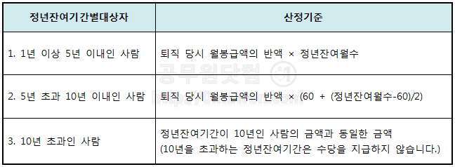 즉 1년 이내 1년 이상 20년 미만 근속하고 자진 퇴직하는 경력직 공무원들이 대상이라고 할 수 있습니다. 그래서 조기퇴직수당 계산법으로는 월봉급액의 6월분 상당액을 조기퇴직수당으로써 지급받게 되는 부분입니다. 이외에도 자진퇴직(자진하여 퇴직하는 부분)등이 있습니다.