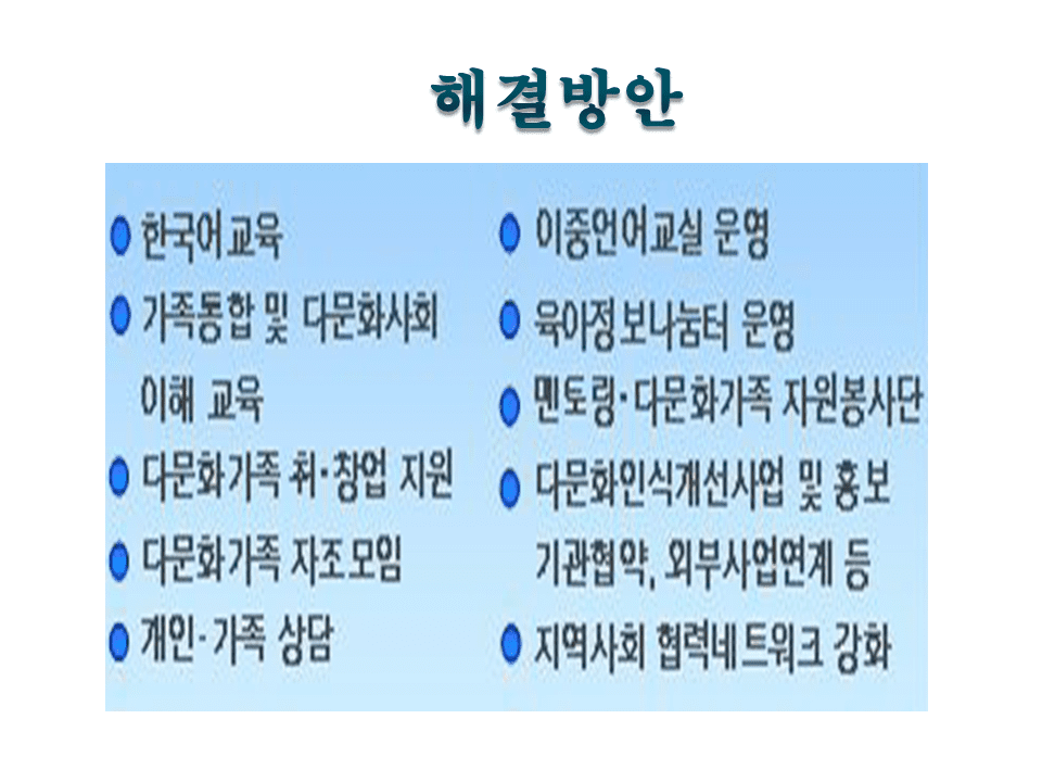 위에서 말한 4가지 해결방안을 간단하게 설명할 수 는 없습니다. 해결해나가야하는 문제들이 너무 많이 있지만 가장 큰 해결방안들로는 [ 언어문제 ( 외국인 배우자들이 한국어를 배울 수 있는 한국어 강좌들이 많이 늘어나고 그에 대한 교육 지원 이라고 할 수 있습니다. 그리고 언어 소통을 위한 단계별적 지원이 필요하다고 할 수 있습니다.), 문화갈등 (문화적 갈등은 언어적 문제가 겹치면서 더욱 커지는 것입니다. 그렇기에 모국에서 가지고 있던 문화적인 부분을 해결하기 위한 한국 문화에 대한 여러 행사 및 정보를 나눌 수 있는 그룹적인 지원들이 필요합니다.), 편견과 차별 (학교에서의 외국인에 대한 인종적인 발언 및 편견을 선생님들이 지워주고 그것을 교육시켜야 합니다. 아이들에게 영상자료와 온라인 자료등을 통해서 좀더 친숙하고 가깝게 다가갈 수 있는 교육이 필요합니다.), 사회 및 경제적 문제 ( 경제적 문제를 해결하기 위해 외국인이 좀더 취업하는 부분에 있어서 가깝게 다가갈 수 있고 외국인들에 대한 취업 부분을 확대해야 하는 것 입니다. 특히 외국인이 취업을 하기 위한 다양한 교육 프로그램들이 다양해져야 하는 부분입니다.)]