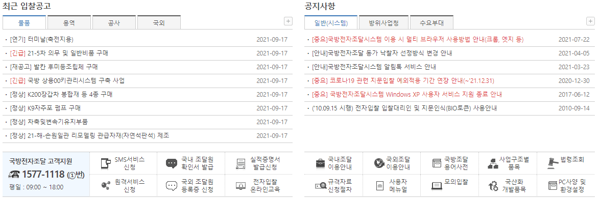 국방전자조달시스템이란? 국방 분야의 물품과 용역, 시설, 국외 등 군수품 조달 관련의 모든 과정을 온라인으로 처리하는 시스템입니다. 국가를 당사자로 하는 계약 관련 법률 시행령에 따라서 국가 계약을 위한 입찰공고는 나라장터에 공고하게 되어있어서 국방전자조달시스템에 등록되어있는 입찰공고 역시 나라장터와 연계되어서 같이 공고되고 있는 것이라고 합니다. 그래서 국방전자조달시스템 가입방법은 [포탈 접속 > 로그인 후 사용자등록 > 사업자등록번호 입력 > 조달업체 대표자 등록 체크 > 동의함 등 서약서까지 체크 후 클릭 > 아이디와 조달시스템 이용에 대한 부분 작성 및 등록 > 회원가입 완료 후 입찰 참가] 이렇게까지 회원가입을 진행하시고 경쟁입찷에 참여하시면 됩니다. 경쟁입찰은 3가지 종류가 있습니다. [일반경쟁 (자격요건을 갖춘 불특정다수의 업체들로 사전 제시된 낙찰자결정방식으로 계약 체결하는 방법), 제한경쟁 (입찰 참가자격을 실적, 기술, 보유상황등에 따른 입찰 참가 제한 낙찰자와 계약을 체결), 지명경쟁 (특정 다수인을 지명 입찰 참가 후 낙찰자와 계약을 체결)] 이렇게 3가지가 있고 이것을 [일반경쟁입찰, 제한경쟁입찰, 지명경쟁입찰] 방식으로 진행이 됩니다.