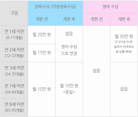 영아수당 도입 및 아동수당 대상이 확대됩니다. 해당 지원은 2022년 1월 1일 이후의 출생한 만 24개월 미만의 아기들 돌보고 있는 가정들에 매월 30만원씩 지급되게 됩니다. 또 매월 10만원씩 지급되는 아동수당의 지원 대상이 만 7세 미만에서 만 8세 미만으로 확대되었습니다. 양육수당과 영야수당 부분에서 바뀐 부분은 이미지를 참고하여 주시기 바랍니다. 해당 지원 수당들은 주민등록상의 주소지에있는 주민센터에서 온라인은 복지로 홈페이지를 통해서 지원금을 신청하실 수 있습니다. 출산률이 저조한 부분에서 다양한 복지제도들이 나온만큼 많은 신혼부부 또는 결혼하는 세대들이 제대로된 지원을 받아서 좀더 화목한 가정을 꾸릴 수 있으면 좋겠습니다.