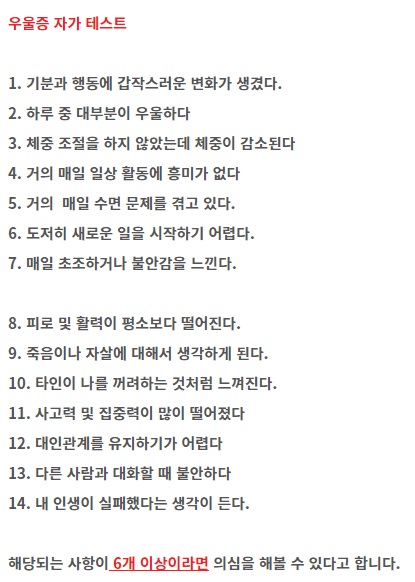 초기증상으로는? 의욕이 없고 무기력합니다, 불면증과 식욕저하가 생겨서 에너지가 부족하고 신체적 기능도 영향을 미쳐 소화불량과 가슴이 답답하게 됩니다. 또 어깨 통증과 급격한 몸무게 변화가 오며 피곤하고 기억력감소와 무엇을 하던 자신의 무가치한 존재라는 생각을 하며 부적절한 죄책감을 가지게 됩니다. 또 엄청난 스트레스와 피로가 생기면서 불안감이 생기게 됩니다. 우울증 자가진단은 이미지를 참고하시기 바랍니다. 그리고 극복방법으로는 식단관리가 가장 중요합니다. 영양섭취와 단백질 섭취로 인한 호르몬 조절이 중요합니다. 그리고 건강한 수면 습관을 만들어주어야 합니다. 수면으로 피로를 줄일 수 있습니다. 또 휴식을 취해주어야 합니다. 충분한 휴식은 스트레스를 해소시켜 주며 정신적인 건강을 끌어올려주기도 합니다. 스트레스를 풀수 있는 자기만의 취미를 가지는 것도 좋습니다. 그리고 가장 중요한 것은 운동입니다. 신체적으로 건강하면 정신적으로 건강하게 되는데 하루 30분만이라도 운동을 해준다면 매우 좋아질 수 있습니다. 운동은 자전거, 달리기, 수영등이 좋습니다. 그외에는 우울증 치료를 통하여 좋아지는 방법이 있습니다. 물론 약물치료, 심리상담등이 있습니다.