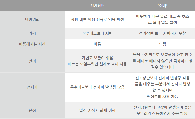 전기장판과 온수매트 장단점을 간단히 정리해보겠습니다. 아래 표를 참고하시기 바랍니다. 그리고 보관방법은 매트와 온수통의 물을 전부 뺀 상태에서 충분히 건조를 해주고 보관하셔야 합니다. 물을 빼지 않고 보관한다면 엄청난 악취가 발생하게 되어서 버려야 되는 상황이 생길 수 있습니다. 특히 한달 이상 사용하지 않게 될때 방치해 둔 보일러 속 고인물이 썩는 등의 문제로 세균의 온상이 될 수 있습니다. 이런 온수매트의 종류에서는 [자연순환방식(무동력), 모터 순환방식(동력), 펠티어방식(냉온수매트, 반도체)] 종류들이 있습니다.