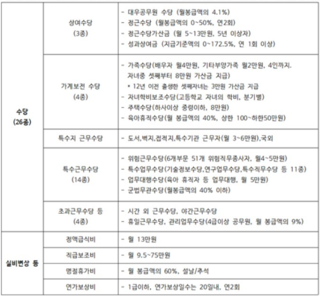 수당의 종류에서는 상여수당, 가계보전수당, 특수지 근무수당, 특수근무수당, 초과근무수당, 정액급식비, 직급보조비, 명절휴가비, 연가보상비로 나뉘어져 있습니다. 여기서 초과근무수당은 5급 이하의 공무원으로 규정된 근무시간 이외에 근무한 공무원들에게 지급되는 초과근무수당과 4급 이상의 관리자에게 지급되는 관리업무수당이 있습니다.경찰공무원들의 업무 강도에 대한 이야기를 하시는 분들도 있지만 경찰공무원으로써 충분한 수당을 받고 있다고 할 수 있습니다. 물론 경찰분들이 많은 업무강도와 어려움들이 있는 것은 이해하고 있고 충분히 감사하고 있습니다.이렇게 2023년 경찰공무원 봉급표에 대한 내용으로 도움이 되셨으면 좋습니다.