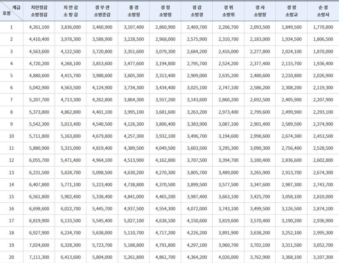 2023년 경찰공무원 봉급표 안내해드립니다. 해당 봉급표는 확정된 봉급표이며 경찰공무원에 대한 봉급인상률과 기본급에 대해서 안내해드리겠습니다. 자세한 정보는 인사혁신처에서 확인이 가능하며 남자는 국가를 위하여 헌신한 군대기간을 호봉으로 인정하여 순경 3호봉에서 부터 시작 여자의 경우 순경 1호봉에서부터 시작하게 됩니다. 기본급 이외에 주어지는 추가 수당까지 더하게 되면 같은 순경이어도 1호봉과 3호봉에 대한 봉급 차이는 꽤 나게 됩니다. 22년 경찰공무원 봉급표와 23년 경찰공무원 봉급표를 비교해보시기 바랍니다.