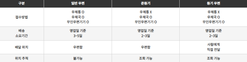 우편을 보낼때 등기는 보통 우체국을 이용합니다. 이때 우체국 준등기를 이용하게 되는데요. 이때 준등기는 등기와 유사한 방식의 우편물을 취급하고 있습니다. 배송 과정에서 우편물의 안전성을 보장하면서 배송비용까지 절감할 수 있는 방법이기도 합니다. 준등기는 비용이 저렴하지만 배송 추적이 가능해서 최근 1 ~ 2년 사이에 포토카드를 거래하는데 많이 사용되고 있기도 합니다. 그래서 배송기간으로는 보통 2 ~ 3일 정도걸린다고 합니다. 그리고 배송 완료 후 문자, 카톡으로 우편물이 도착했다는 알림을 받을 수 있게 됩니다. 일반우편, 준등기, 등기우편에 대한 기간, 위치 등에 대한 내용은 아래 표를 참고해주세요.