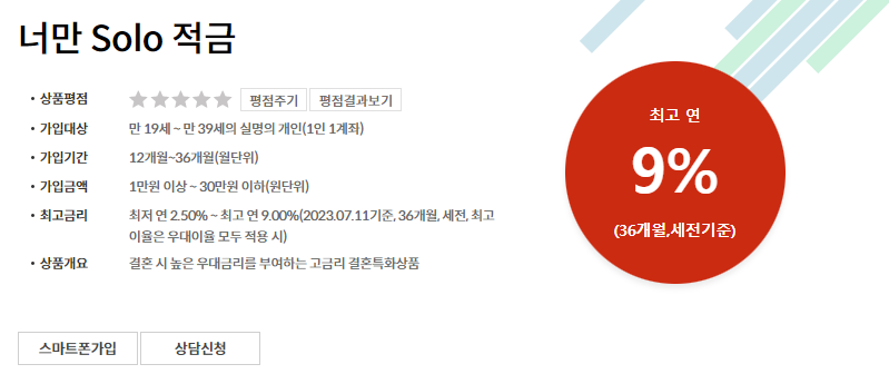 너만솔로적금 가입대상: 19세 ~ 39세 실명의 개인으로 1인 1계좌만 허용