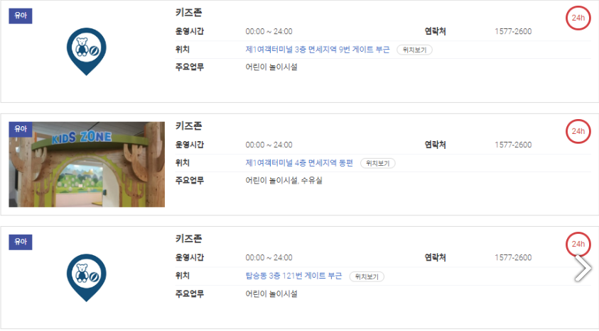 위치에 대한 정보의 정보에 대한 궁금하신 부분이라던지 정확한 위치 안내는 인천공항안에서 공항 직원들에게 물어봐도 되지만 유선상으로도 문의하여 안내 받으실 수 있습니다. 공식번호로 1577-2600 번이라고 하니 참고하시고 전화하셔서 이용해 보시기 바랍니다. 조카들이 많아서 가족단위로 여행을 많이 가는데 갈 때마다 한번씩 들렸던거 같습니다. 솔직히 인천공항에 가서 비행기 시간 기달리다 보면 굉장히 지루할 때가 많고 좀 자면서 쉬고 싶은데 그러지 못할 때가 있습니다. 물론 자면 안되기에 아이들이 신나게 놀고 체력을 빼놓을 수 있는 곳으로는 키즈존의 놀이방 같은 곳들이 정말 좋은듯 합니다. 그리고 유아들의 경우 아이가 울 때 꼭 필요한 수유실 장소들은 꼭 알아 두시는 것도 좋을듯 합니다.