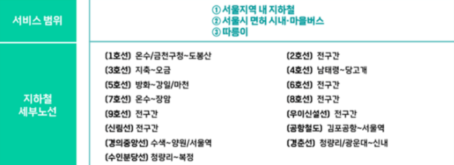 좀더 구체적으로 이야기 해서 지하철은 [2,6,8,9호선, 신림선, 우이신설선 전구간 & 1,3,4,5,7호, 공항철도, 경의중앙선, 경춘선, 수인분당선 일부구간 (신분당선은 이용불가)] 버스는 타.시도.면허버스, 광역버스, 심야버스도 이용이 불가하다고 합니다.] 따릉이는 1시간 단위로 이용이 가능하다고 하니 참고하시기 바랍니다.