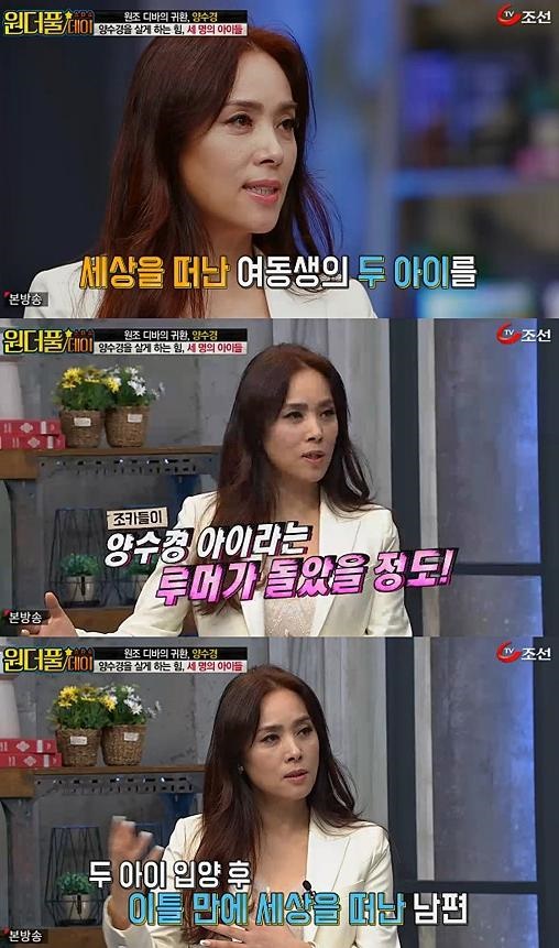 이에 대해 양수경은 과거 한 방송에서 "자녀가 셋이다. 제가 낳은 아이는 하나도, 동생이 먼저 세상을 떠난 후 키운 내 조카 둘이다"라며 "양수경이 숨겨놓은 아이가 있다는 소문이 있었다"고 말했습니다. 이어 "아이들이 클 때까지 키우기로 하고 입양을 했는데, 남편이 세상을 떠났다"며 슬픈 사연을 공개하기도 했습니다. 이어 양수경은 "아버지가 세상을 떠난 후 공황장애를 앓았다. 방황하고 힘들어 한 저는 지켜 준 건 아이들"이라며 아이들에 대한 애정을 드러내기도 했습니다.