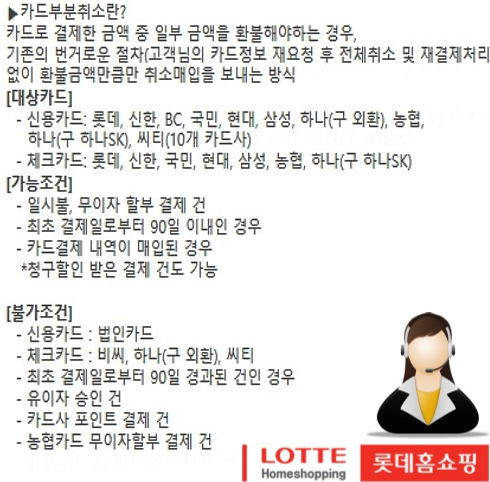 카드결제에서 일부 금액 취소 환불은 카드부분 취소로 가능하며 카드부분취소는 카드로 결제 진해된 일부 금액을 환불 하게 되는 경우 입니다. 이와 같은 자세한 사항은 롯데홈쇼핑 고객센터 전화번호로 전화 상담하여 자세하게 안내 받으시기 바랍니다.