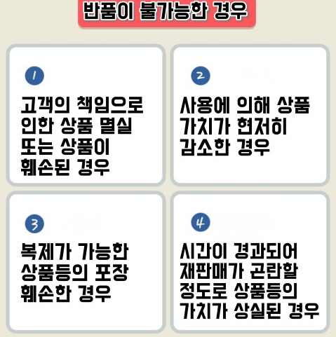 마지막으로 주문자 책임으로 인하여 상품 또는 제품이 훼손등의 경우 제품 사용에 의하여 상품 가치 등이 현저하게 감소하였을 경우 복제 가능한 제품의 포장을 훼손된 경우 반품요청 가능 기간이 지난 경우의 여러 경우에 반품 또는 환불등이 진행 안될 수 있는점 참고 하시기 바랍니다.
