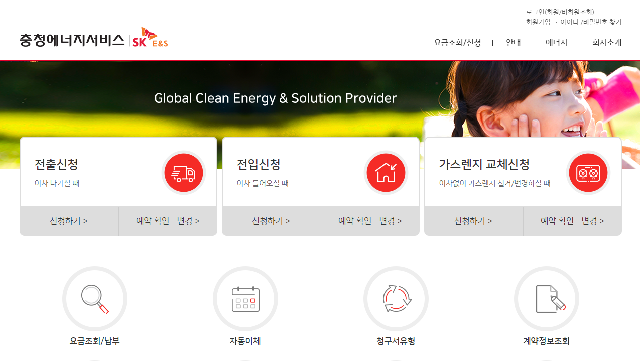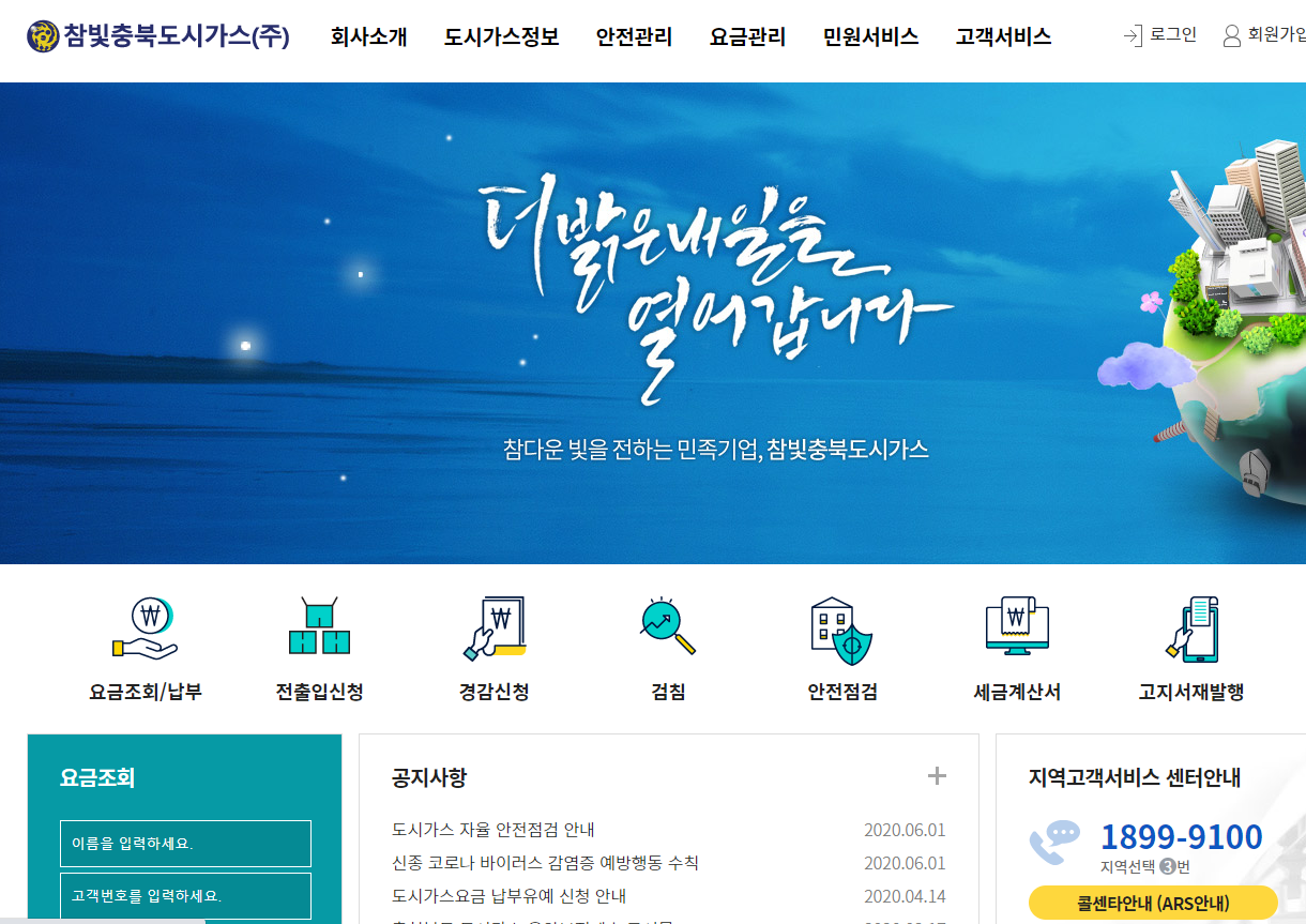 충청에너지서비스 홈페이지로 들어가시면 메인에서 전출신청이나 전입신청, 가스렌지교체신청,요금조회/납부서비스등의 서비스를 이용하실 수 있습니다. 이 곳도 위에 설명드린 것과 똑같이 전출 전입 같은 경우는 예약 서비스로 가능하며 참빛과 충청 둘다 똑같이 로그인을 하셔야 이용이 가능합니다. 청주도시가스 고객센터 및 온라인서비스를 원하시는 분이라면 해당 사이트를 이용하시면 될듯 합니다. (홈페이지링크)
