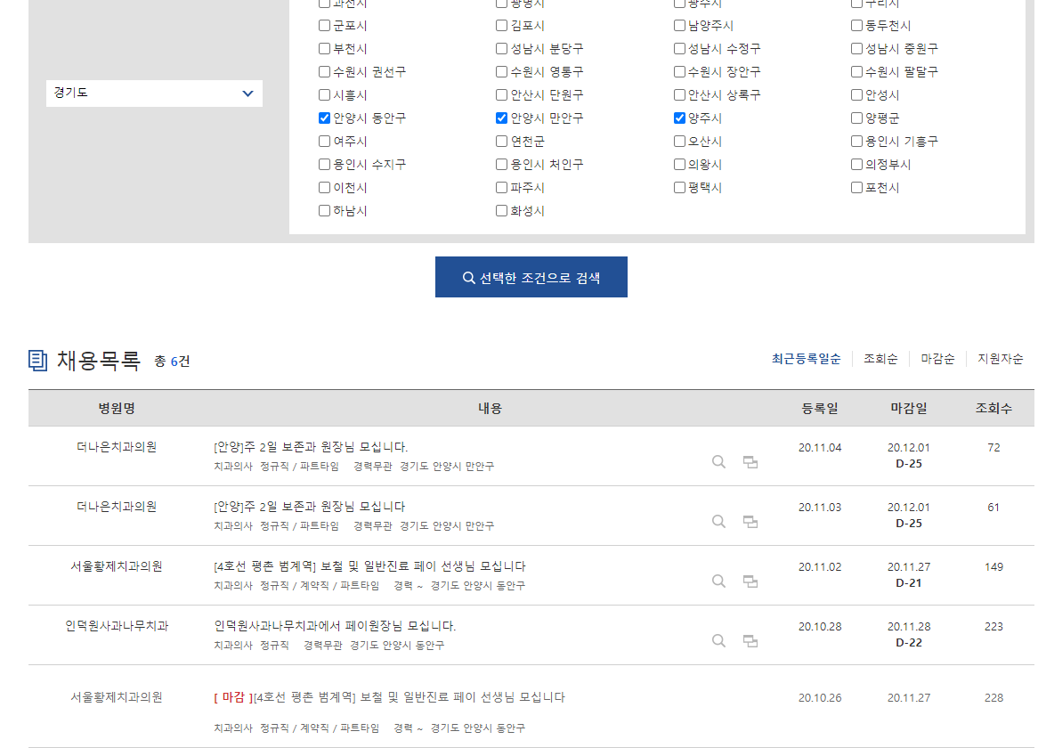 kda 덴탈잡 다음으로는 지역별 채용정보를 확인해보겠습니다. 지역별에서는 서울, 부산, 대구 등 각 지역을 누르면 해당 지역의 구 지역이 나오는데요 해당 지역들을 눌러 주시고 검색하시면 그곳에서 뽑고 있는 채용정보가 나옵니다. 업무별을 보는 것보다는 가까운 지역으로 취업하고자 하시는 분이라면 지역별로 체크 하시는게 좋을듯 합니다.