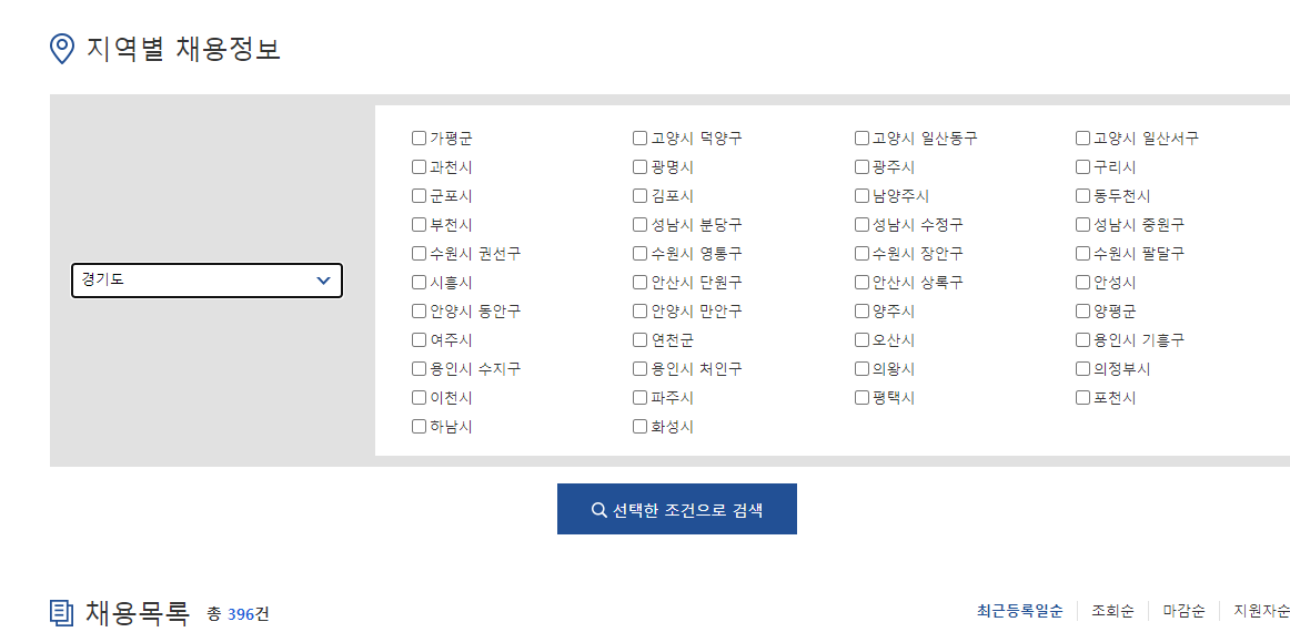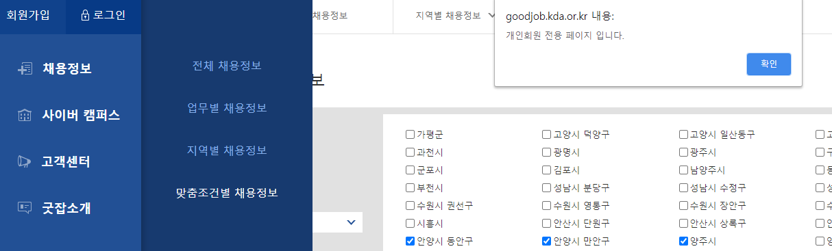 다음으로는 맞춤조건별 채용정보 입니다. 맞춤조건별은 말그대로 현재 취업하고자 하는 본인의 정보가 필요하여 로그인 후 이용이 가능 합니다.