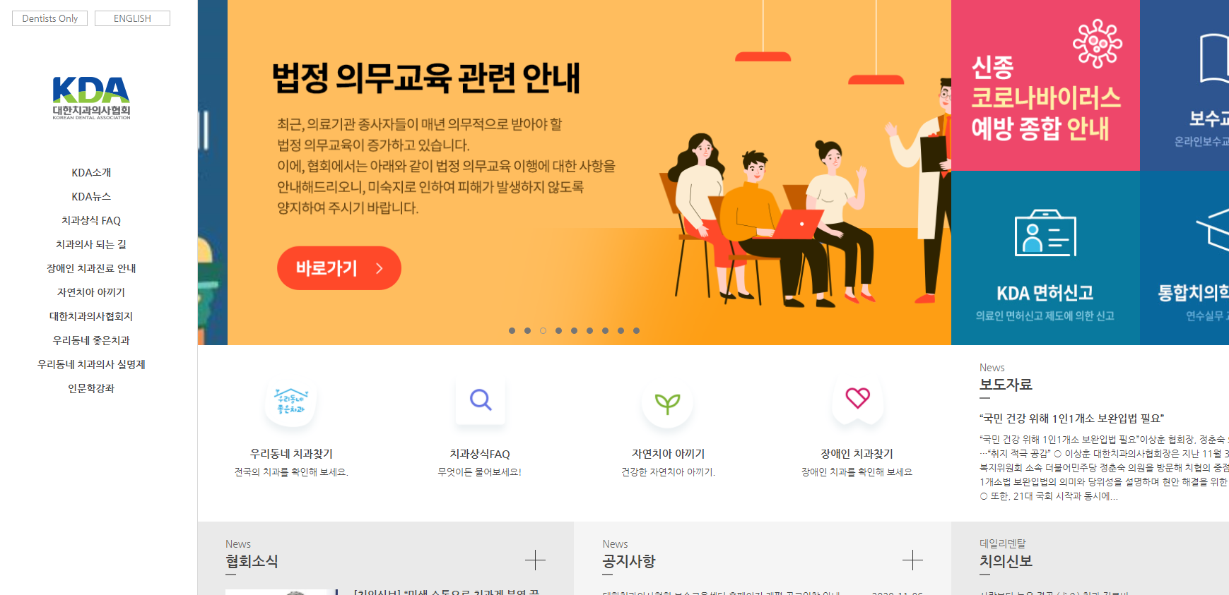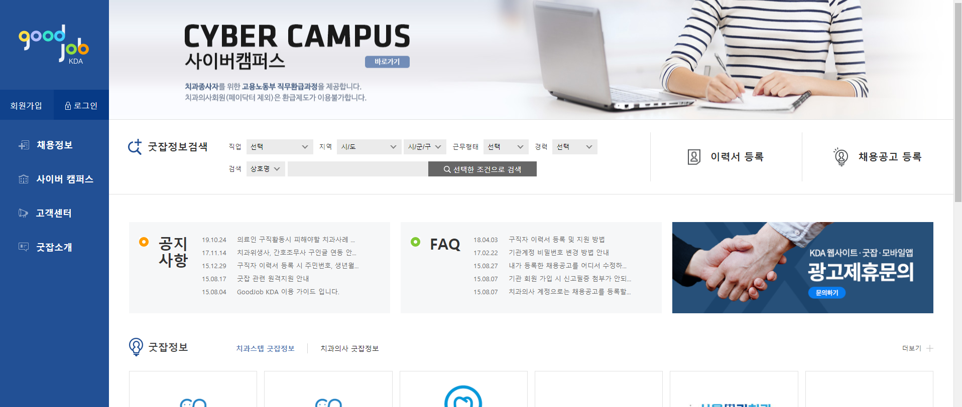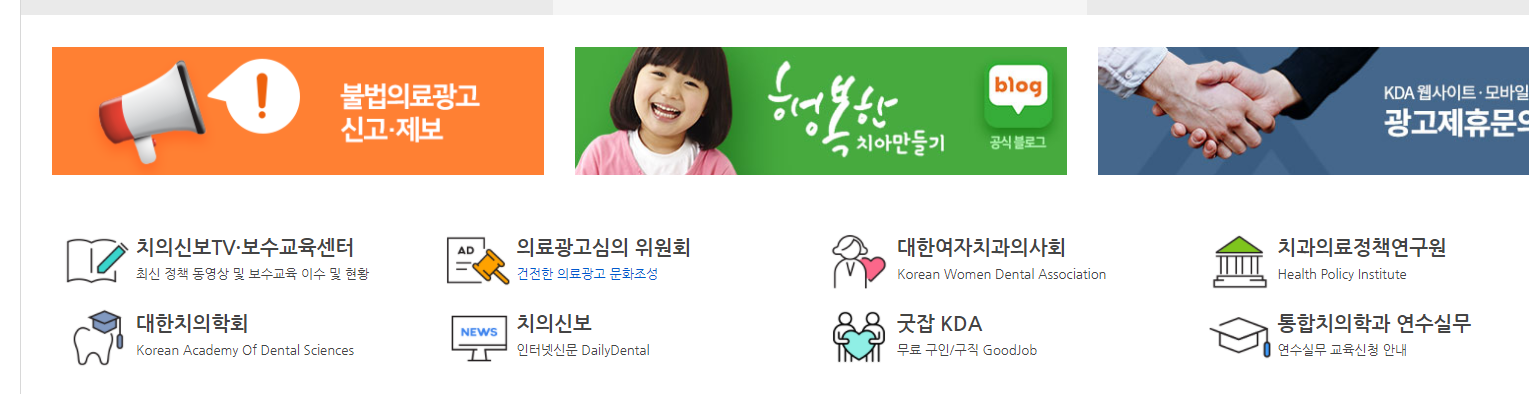 우선 해당사이트는 대한치과의사협회에서 운영하는 사이트로 네이버에 대한치과의사협회를 검색하시면 사이트로 들어가실 수 있습니다. 해당 사이트로 들어가신 후 메인 페이지에서 굿잡 kda가 나오는데요. 그것을 눌러주시면 다음 설명으로 이어갑니다.