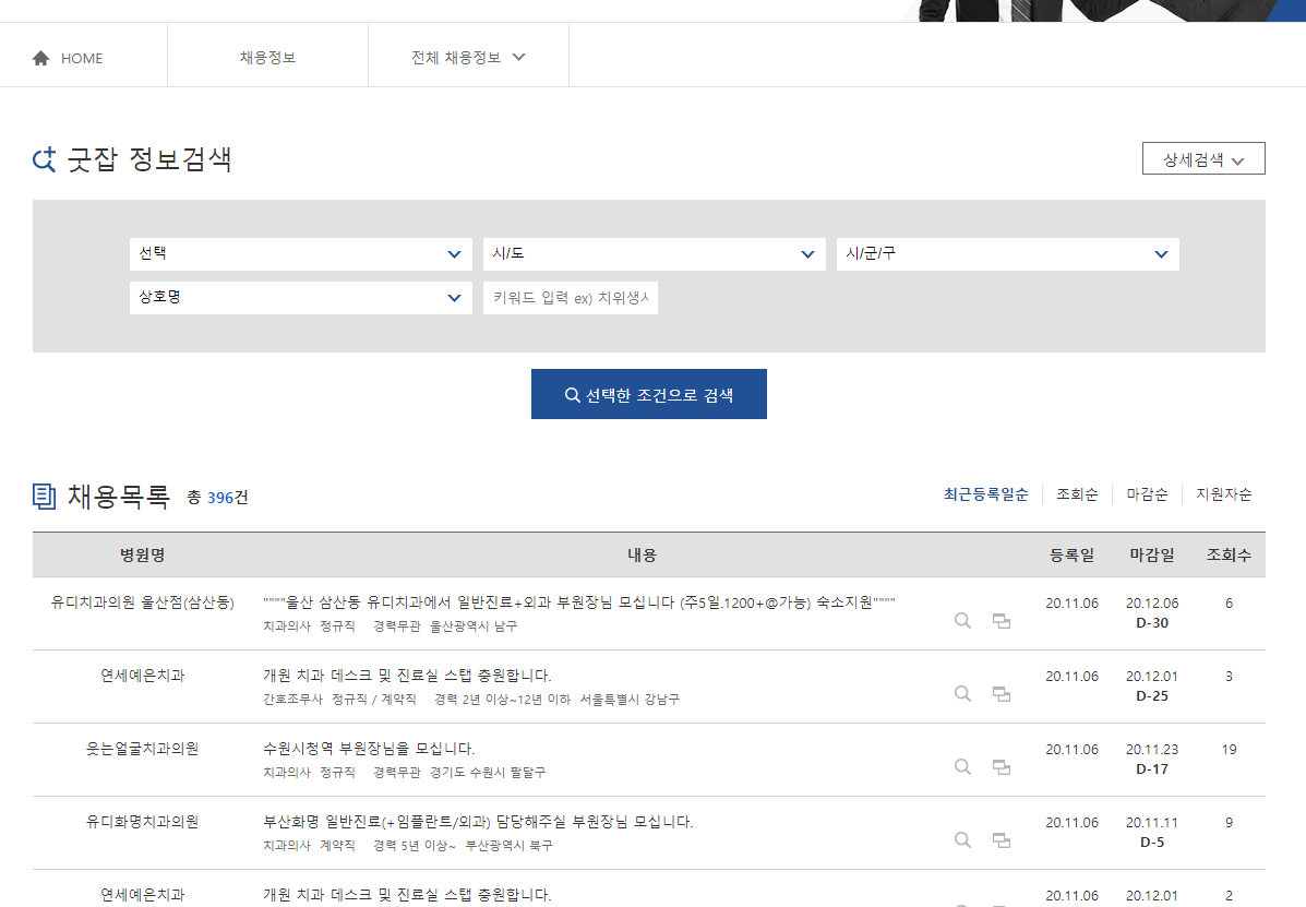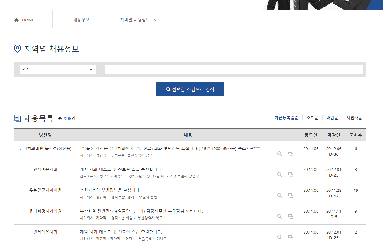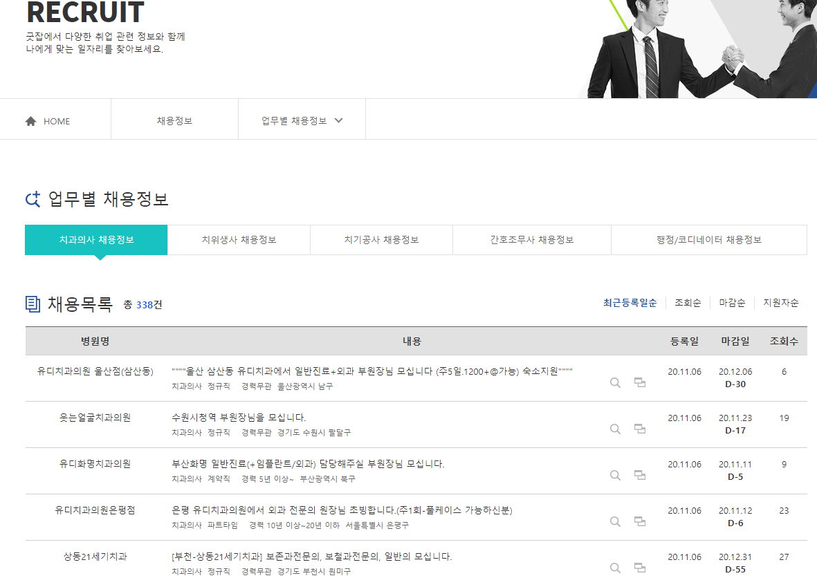 그리고 업무별 채용정보에서는 치과의사, 치위생사, 치기공사, 간호조무사, 행정/코디네이터 채용정보로 나뉘어 있습니다. 업무별로 볼때는 지역을 확인할 수는 없지만 꽤 많은 채용정보가 올라와 있는 것을 확인 하실 수 있습니다.