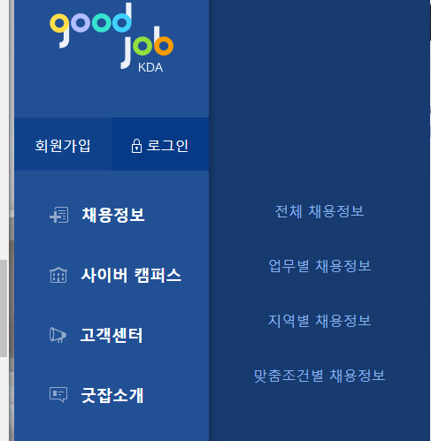 굿잡 kda로 이동하시면 구인구직 및 채용정보 관련으로 카테고리들이 나옵니다. 그리고 채용정보를 누르시면 전체 채용정보, 업무별 채용정보, 지역별 채용정보, 맞춤조건별 채용정보등이 나오는데요. 일단 전체 채용정보는 업무별, 지역별, 맞춤조건별에 대한 모든것이 나오는 카테고리 입니다.