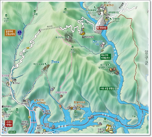 화천군 사내면과 경기도 가평군 북면의 경계에 위치한 1,468m의 산으로 38선이 정상을 가르고 있어 6.25때는 격전지로 비극의 역사를 남겨주고 있는 곳이면서 화악산 등산, 수려한 삼일계곡, 법장사, 화음동정사지 등의 관련자원이 연계되어 있는 곳이라고 합니다.