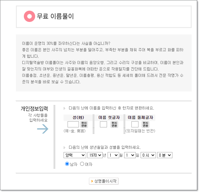 무료 이름풀이는 성, 이름을 한자로 입력하고 생년월일과 태어난시를 적고 성명풀이를 눌르시면 이름에 대한 풀이가 나오는데요. 초년 중년 말년등에 대한 운세가 나옵니다.