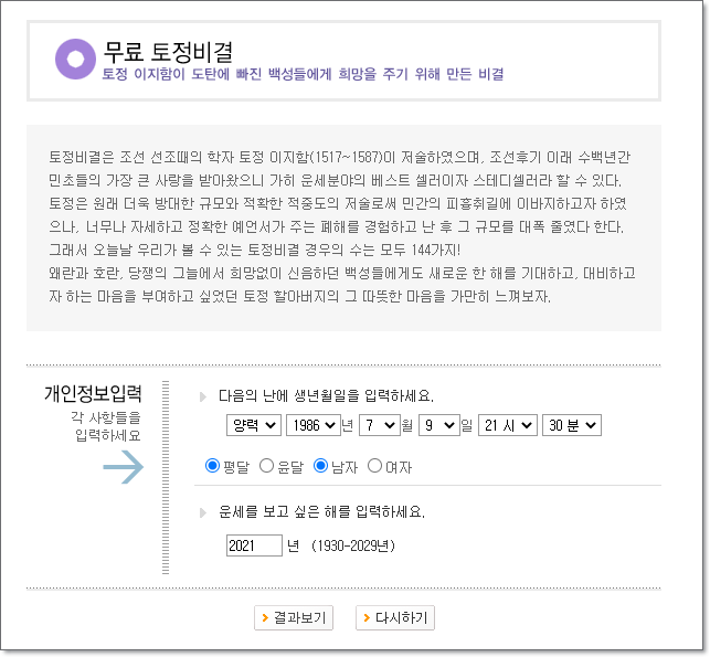 무료토정비결을 눌러보시면 생년월일, 태어난 시 성별을 체크 하시고 운세를 보고 싶어하시는 년도를 적고 결과 보기를 누르시면 1 ~ 12월까지의 운세가 풀이 되어서 나옵니다. 엄청난 디테일성을 가지고 나오는 것은 아니지만 단연코 풀이에 대해서는 아주 괜찮게 풀이 되어서 나오는 무료 토정비결 입니다.