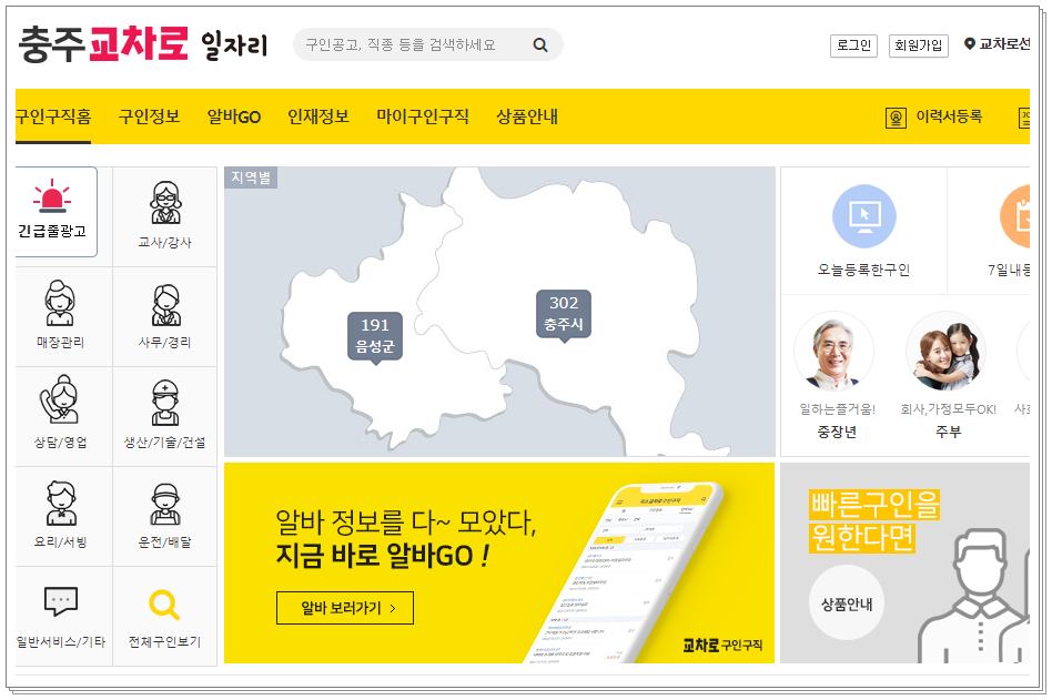 근무지는 충정북도에 해당하는 모든 시/군/구 동 등에서 구하는 일자리들이 올라오고 있습니다. 그리고 중장년, 주부, 대학생등 연령별로 인재를 구하고 있구요. 혹시나 홈페이지에서 구직을 구하기 어렵거나 불편하신 분들은 옛날방식인 충주교차로 구인구직 신문광고를 통하여 구인구직을 하셔도 됩니다.