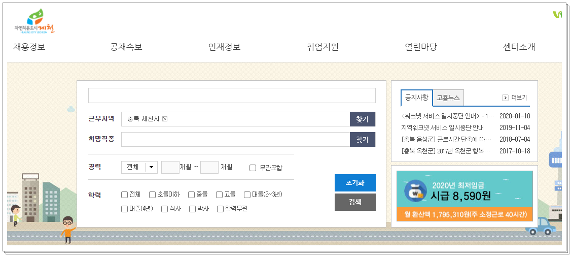 이것은 제천시청에서 자체적으로 운영되고 있는 구인구직 전용 홈페이지 입니다. 이곳의 이용방법은 일반 알바몬, 알바천국, 사람인 같은 구인구직 홈페이지 이용방법과 같습니다.