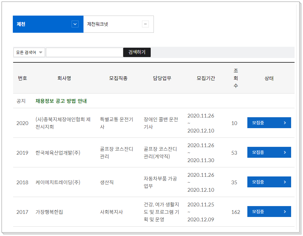 제천에 위치해 있는 여러 기업에서 제천시청 게시판을 통하여 다이렉트로 구인을 모집하는 서비스 입니다. 회사명, 모집직종, 담당업무, 모집기간 등이 나오는데요. 여기서 모집중인것은 계속 모집중으로 체크 되어있으며 모집 완료는 모집종료로 바뀌어 있습니다.