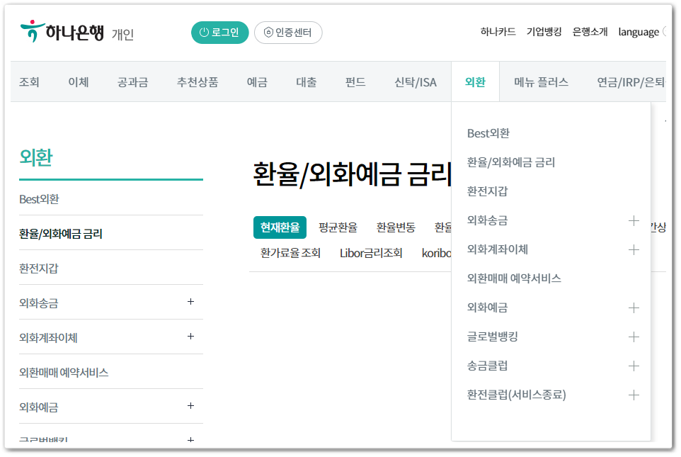 환율에 대해 자세히 알아보는 방법은 또 있습니다. 하나은행 홈페이지를 통해 알아보는 방법인데요. 하나은행 홈페이지에 접속하시면 상단 오른쪽에 외환이라는 메뉴가 보이실 겁니다.