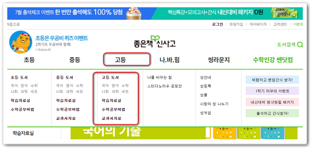 그곳에 접속하시면 초등학교는 물론 중등교육과 고등 교육까지 다양한 학습 정보들이 있습니다. 거기에서 상단부분을 보시면 라이트 쎈 고등 수학을 찾을수 있는 메뉴 "고등"이라는 것 밑에 수학이 있죠.
