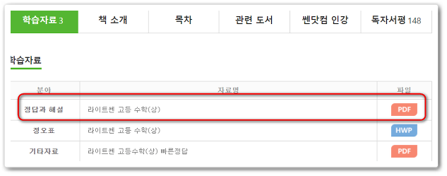 이후 연결된 웹페이지를 살펴보시면 하단부분에 학습자료라는 게 있는데여. 거기에서 라이트 쎈 고등 수학 상 답지를 정답과 해설이라는 부분에서 찾습니다. 오른쪽 끝에 파일이라는 부분에 PDF파일로 다운로드 받을수 있습니다.