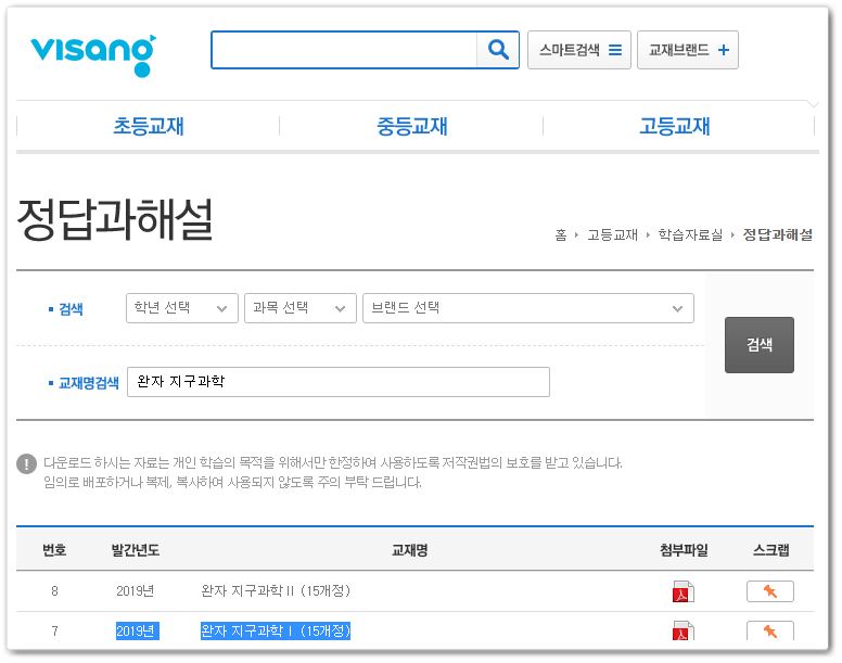 이것 또한 오투 과학과 마찬가지로 네이버로 검색하여 들어 오셨다면 지구과학은 고등교재이기에 비상교재 홈페이지에서 고등교재로 마우스를 옴기시고 학습자료실로 들어가신다음에 교재명에서 완자 지구과학( 완자 지구과학1 답지 )을 검색하시면 많이 나오는데요.