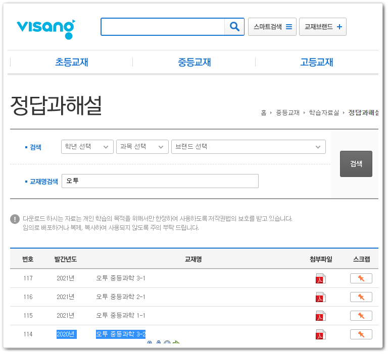 네이버에 ' 비상교재 ' 검색하시구요. 비상교재 홈페이지로 직접 들어가시면 중등교재, 고등교재 카테고리가 보이는데요. 거기서 중등교재로 마우스를 옴기시면 작은 카테고리들이 뜨는데요. 오투 과학 중3-2 답지 거기서 학습자료실을 누르시면 됩니다.