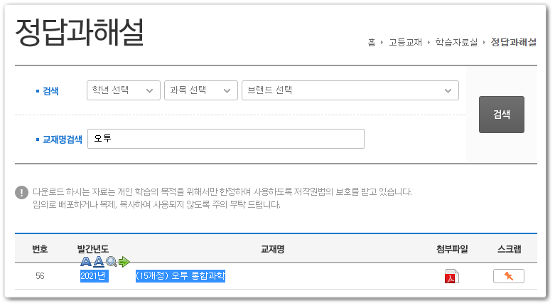 홈페이지에 들어오셨다면 고등교재에서 학습자료실로 들어가시는 방법으로 확인하셔도 되며, 비상 홈페이지에서 검색창에 오투 통합과학을 검색하셔도 오투 통합과학 답지 원하시는 자료가 바로 나옵니다.