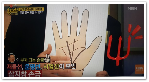 부자들이 공통적으로 가지고 있다는 삼지창 손금은 재물을 불러오는 것으로 유명합니다. 이 손금은 사업선, 재물선, 운명선 3개가 삼지창 모양을 띈 것을 말하며 횡재수가 찾아올 운명이라고 합니다.