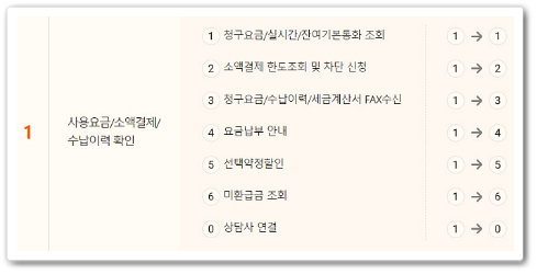 1. 사용요금, 소액결제, 수납이력 확인 서비스. 요금조회, 세금계산서 수신, 미환급금 조회, 상담사 연결 가능.