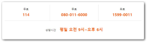 아래에 ARS 단축번호 있으니 확인하시고 전화하면 더욱 빠른 상담이 가능합니다. / 국번없이 114 (무료) / 080-011-6000 (무료) / 1599-0011 (유료) / 상담시간: 평일 오전 9시부터 오후 6시까지