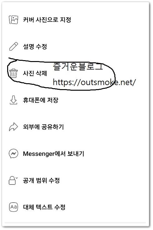 여기서 대표 사진으로 지정 및 설명 수정, 사진 삭제 등 하위 항목이 표시 된다면 사진 삭제 문구를 클릭해주시기 바랍니다. 그렇게 모든 과정들이 완료 되면 페이스북 프로필 사진은 페이스북 기본프사로 바뀌게 됩니다.