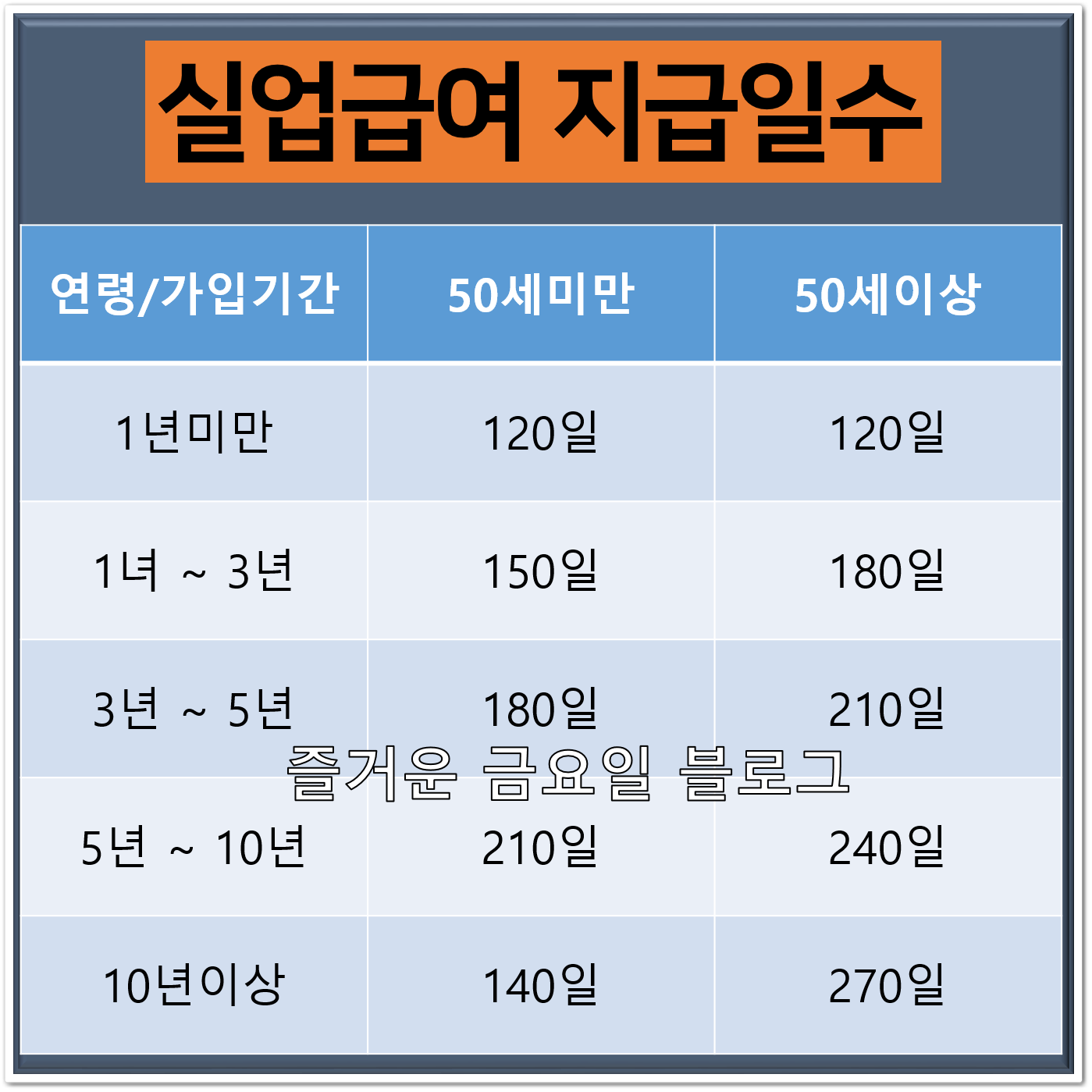 실업급여 지급일에서는 실업급여 지급기간을 소정급여일수라고 합니다. 소정급여일수에서는 실직 할때 즉 이직하게 되는 날 기준의 주민등록번호로 계산된 고용보험 가입기간에 따라 달라지게 됩니다. 또 실업급여 지급기간 최소일수는 120일로 최대일수 기간은 270일 이오니 꼭 참고하시기 바랍니다. 그리고 나이로는 퇴사 당시에 만 나이를 기준으로 하고 있는 점도 참고하시기 바랍니다.