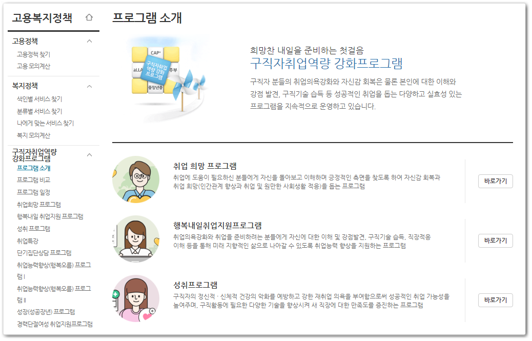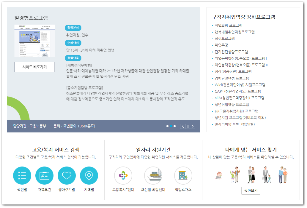 이 서비스는 고용복지정책 말그대로 취업을 위한 고용복지에 대한 다양한 서비스 입니다. 취업하고자 하는 사람들을 위한 취업성공패키지 ( 취업지원, 취업취약계층, 저소득 취업취약계층 ( 진단-의욕-능력증진-집중 ) / 일경험프로그램 ( 취업지원, 연수, 만 15 ~ 34세 이하의 미취업 청년, 재학생직무체험, 중소기업탐방 프로그램 ) / 고용복지센터 ( 고용지원업무를 하는 곳으로 다양한 대민업무를 하는 곳 ) 여기서 중요한 것은 나에게 맞는 고용복지 서비스가 무엇인지를 찾아볼 수 있다는 것입니다. 또 나의 자격요건은 어느정도인지도 체크 가능한 부분입니다.