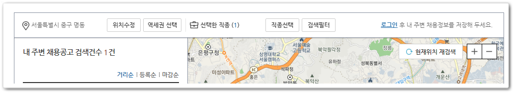 5-1) 내주변 채용정보 : 해당 서비스는 내가 살고 있는 지역을 gps로 잡고 그 지역근처에서 내가 원하는 채용기업이 있는지를 찾아주는 서비스 입니다.