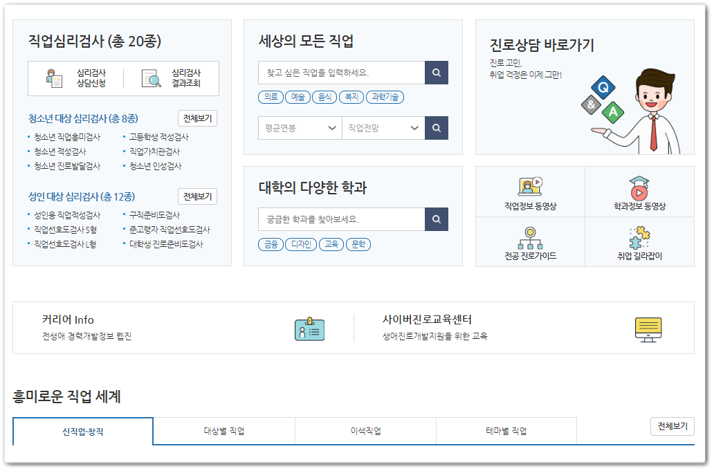 직업.진로 서비스는 말그대로 각 직업군에 대한 설명과 그와 관련된 직업인들에 대한 업무에 대한 이야기 앞으로의 전망에 대한 이야기를 하는 곳입니다. 그리고 그 직업에 대한 진로 적성감사와 함께 심리검사, 상담을 통하여 어떤 교육과 훈련을 해야 하는지에 대하여 안내를 해주는 곳입니다. 현재 내가 하고 있는 일보다 다른 새로운 것을 도전하고 싶다면 또는 내가 하고 있는 직종이 잘 맞는지 안맞는지를 체크하기 위해서는 꼭 필요한 카테고리라고 볼 수 있습니다.