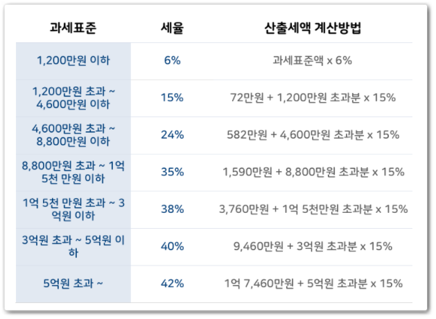한국은 누진세율이 적용됩니다. 소득이 높다면 세율도 커지게 되는 것입니다. 여기서 세율은 최저6%에서 5억이 초과하는 경우에는 최고로 42%까지 적용되게 됩니다.