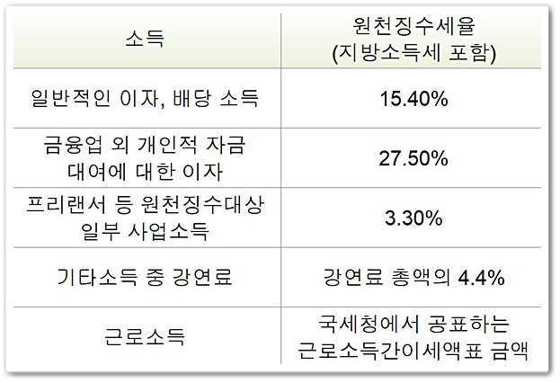 특수한 부분으로 소득 발생되었을 때 항상 하는 것이 세금 신고 입니다. 그리고 원천징수는 소득이 발생하면 합산하여 종합소득 과세표준을 계산 다음해 5월 중 세무서에 신고, 그러나 1년간 본인 소득을 계산 후 다음해 5월 신고 납부 하는 것은 현실적 불가하기에 소득세법으로 소득을 지급하는 자가 세금을 떼어 소득을 받는 사람 대신 신고, 납부하는 것이 원천징수 입니다.