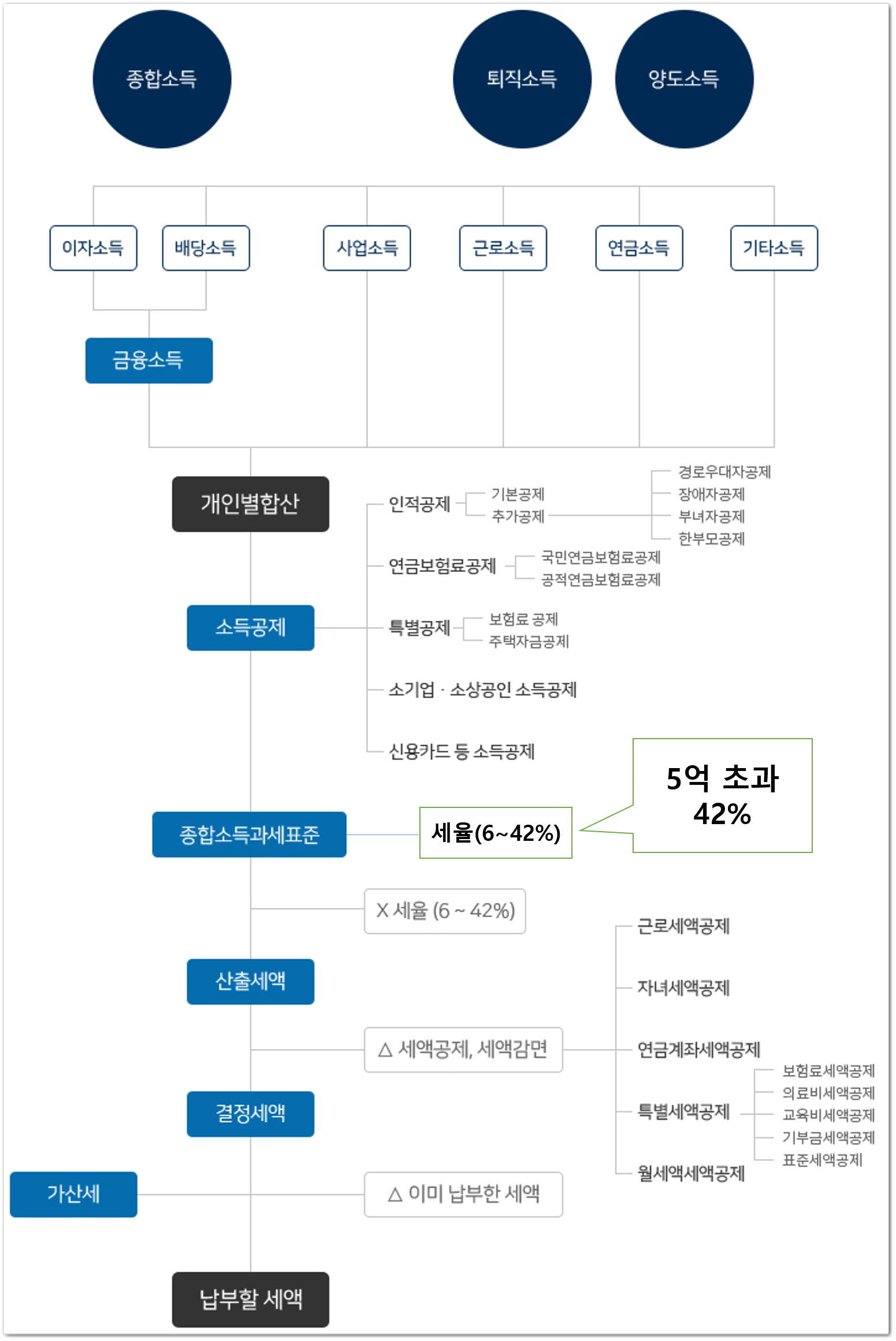 한국은 누진세율이 적용됩니다. 소득이 높다면 세율도 커지게 되는 것입니다. 여기서 세율은 최저6%에서 5억이 초과하는 경우에는 최고로 42%까지 적용되게 됩니다.