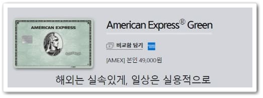 아메리칸 익스프레스 그린카드의 기초 혜택으로 대한민국 가맹점 0.5% 적립, 항공, 백화점, 온라인쇼핑몰 등 큰 마트는 1% 적립, 면세점 국외 가맹점은 2% 적립됩니다. 롯데시네마, cgv에서 영화 관람할 때 연 12회 월 1회 또 전월 실적에 따라 50만원 이면 1만원 결제 할때 오천원 일정 부분 할인도 가능합니다. 스타벅스 20% 할인됩니다. 이 밖에도 호텔 및 프리미엄 음식점등에서도 다양한 혜택과 할인이 적용 됩니다. 거기에 코스트코, 백화점, 면세점 등에서 연간 1회로 십만원 이상 결제할 때 2만원 청구 할인이 적용 됩니다.