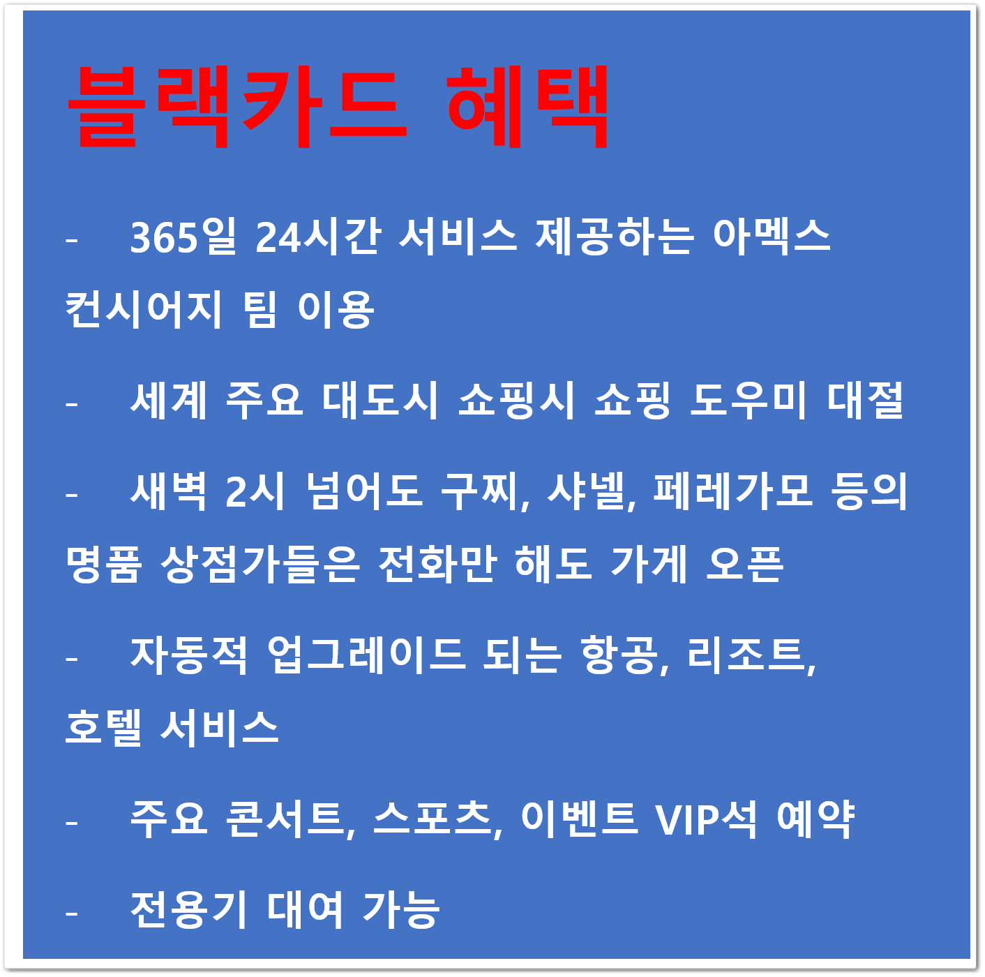 이 밖에도 엄청난 혜택들이 있는 블랙카드는 보여주기만 해도 성공했다는 것을 보여줄 수 있는 카드라고 합니다. 대한민국 삼성카드, 현대카드 등의 카드사들과는 노는 물 자체가 다른 카드가 아메리칸 익스프레스 블랙카드라고 할 수 있습니다.